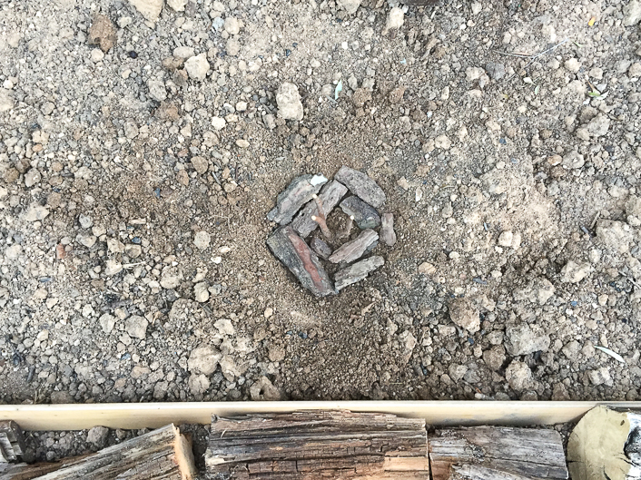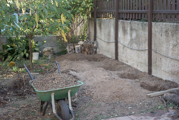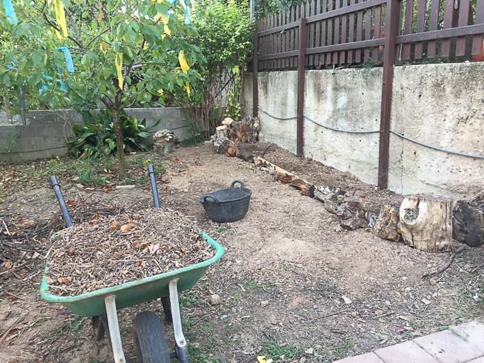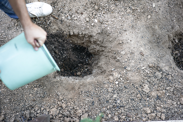 Primero: una capa de compost vegetal aun no descompuesto del todo. Este tipo de compost está hecho en casa únicamente con material vegetal triturado (restos de ramas, hojas, cortezas…), y como no estaba descompuesto del todo, tiene algunos trozos un poco mas grandes. Al ponerlo en el fondo del agujero, actúa como capa drenante, muy importante para que las raíces no se queden encharcadas y se pudran por exceso de riego.