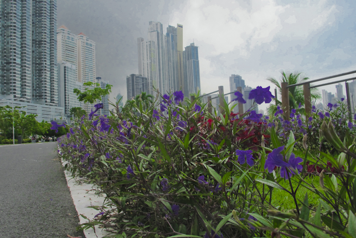 Al volver para casa el cielo se nubló y había un poco de brisa, así que me dediqué a fotografiar las flores y árboles que mas me fueron llamando la atención. Siempre con los rascacielos de fondo y con el beneplácito de Emma, que estaba tan cansada que no dijo «esta boca es mía».