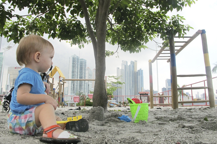 Algún fin de semana bajamos a pasear, siempre cuando empieza a anochecer. Pero ayer por la mañana me apetecía hacer castillos de arena con Emma, y el único parque con arena que conozco está en la Cinta Costera, como a 1 km de mi casa. Aprovechando que Emma había madrugado y estaba bastante cansada (pero no lo suficiente como para dormirse otra vez), la senté en el carrito y no puso resistencia ninguna.