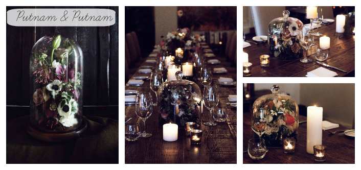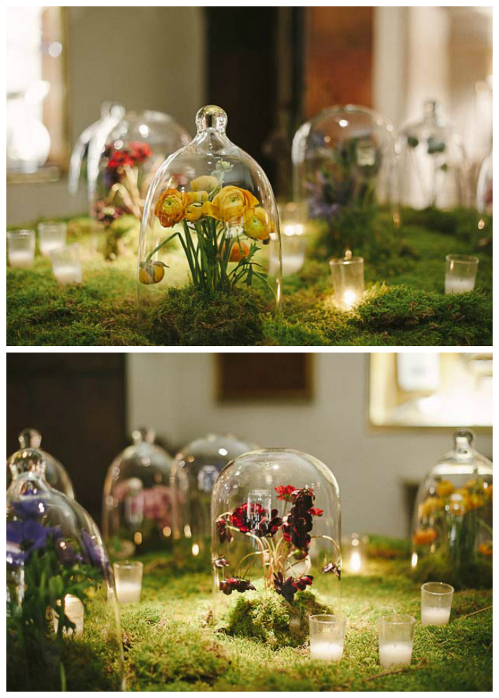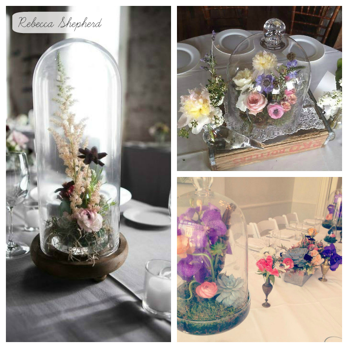 Esta decoración fue obra de la florista neoyorquina Rebecca Shepherd (habitual en los principales blogs de bodas americanos, Pinterest, etc). Fue una pionera utilizando estas campanas de cristal y las ha utilizado en numerosas ocasiones mas. Aquí tenéis una muestra resumen, con campanas de diferentes tamaños, algunas incluso con pedestal elevado.