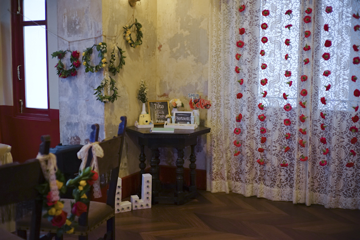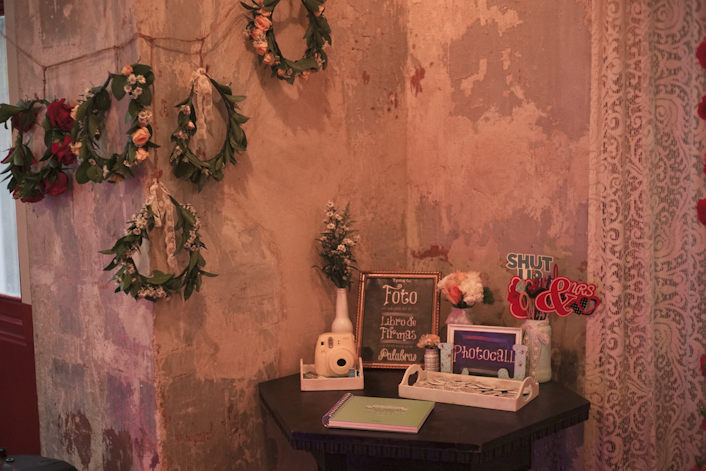 Además hicimos coronas de flores para «disfrazarse» en el photocall, pero también con clase, y además quedaban monísimas como decoración colgadas de la pared (invento de mi super-marido, que no se que habría hecho sin él). Los invitados ya disfrazados posaban en el photocall: una cortina de claveles fucsia, que con la cortina de ganchillo detrás quedaba espectacular. Esta mesa fue todo un éxito.