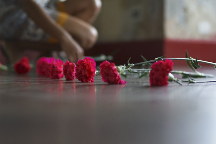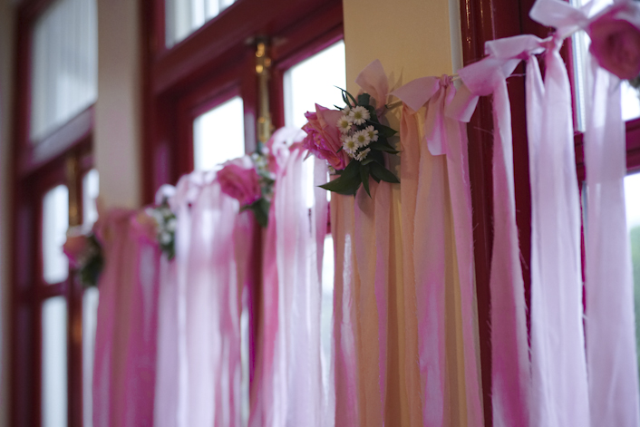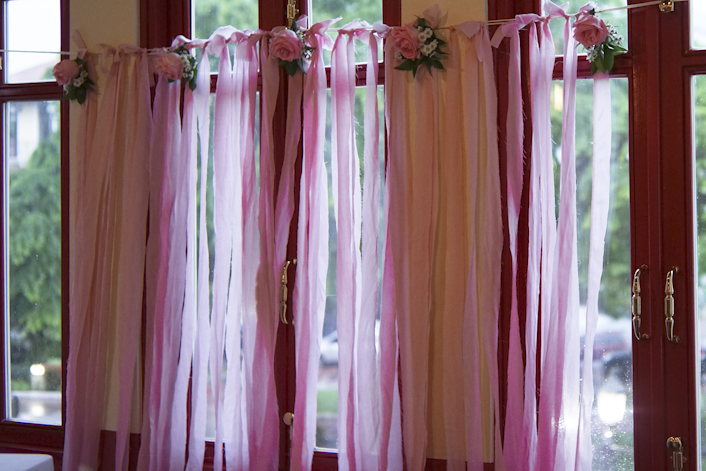 La cortina de flecos rosada la teñí yo personalmente para conseguir el tono de rosa que quería, y la decoramos con rosas, aster y ruscus.