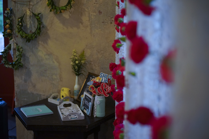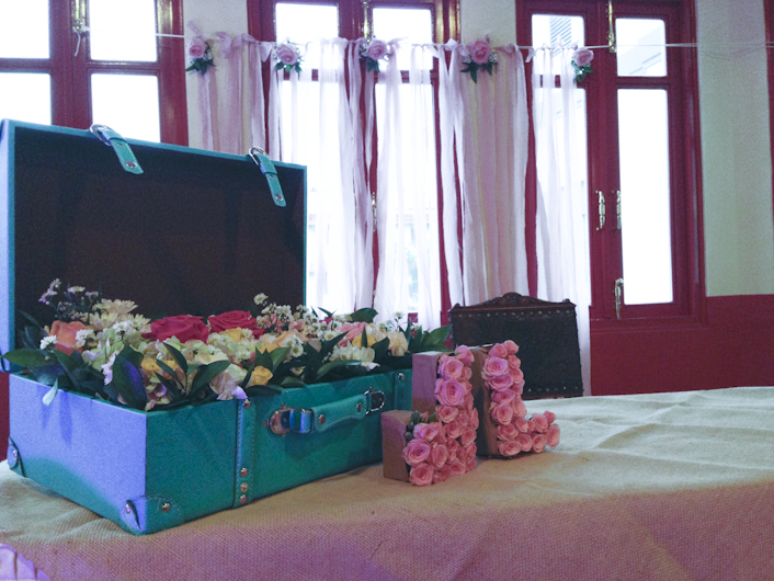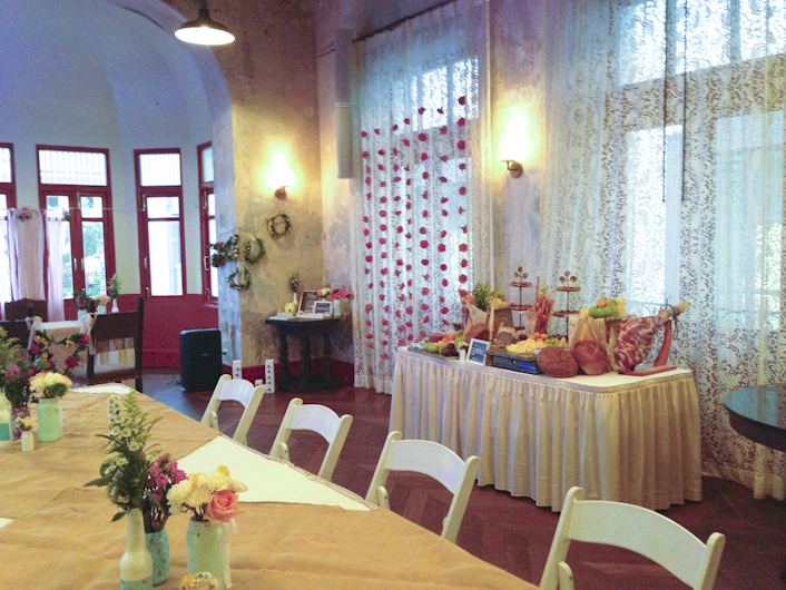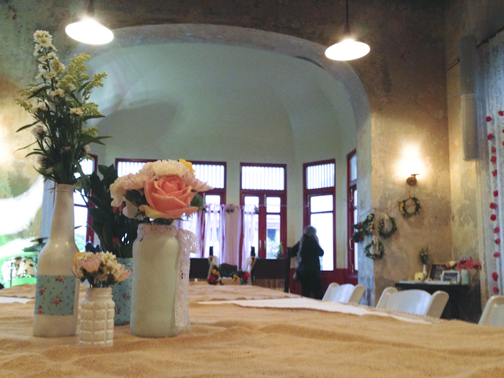 Sus paredes desgastadas parecen contar las miles de historias vividas ahí dentro. Los ventanales rojos y las cortinas de encaje hacen que sea un sitio como de cuento. El balcón y el patio interior también son preciosos pero diciembre en Panamá es época de muchas lluvias así que tuvimos que montarlo todo dentro, y no importó nada porque quedó bonito igual.
