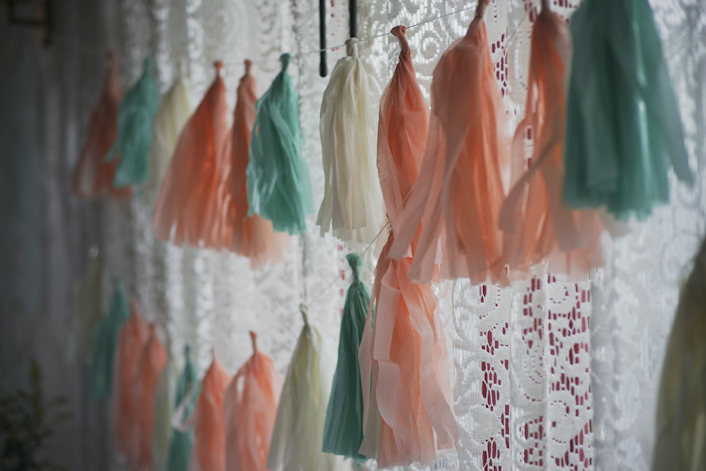 Para la mesa de dulces hice unas guirnaldas de papel pinocho que con las cortinas de ganchillo de fondo quedaban para morirse de bonitas.