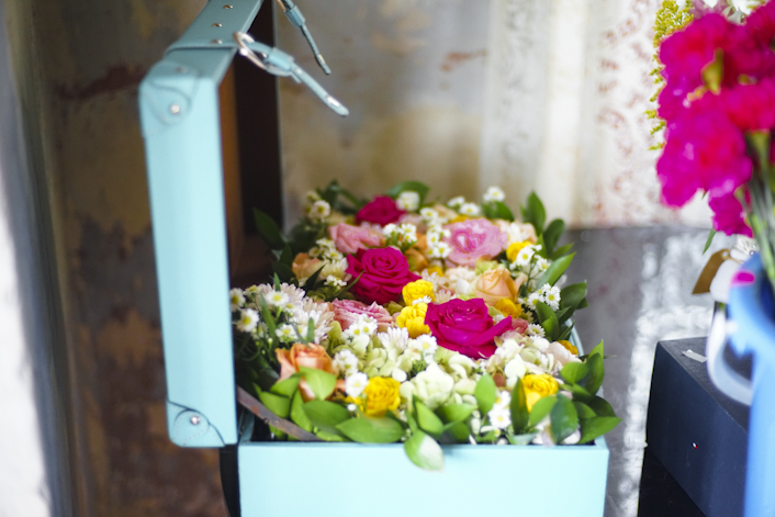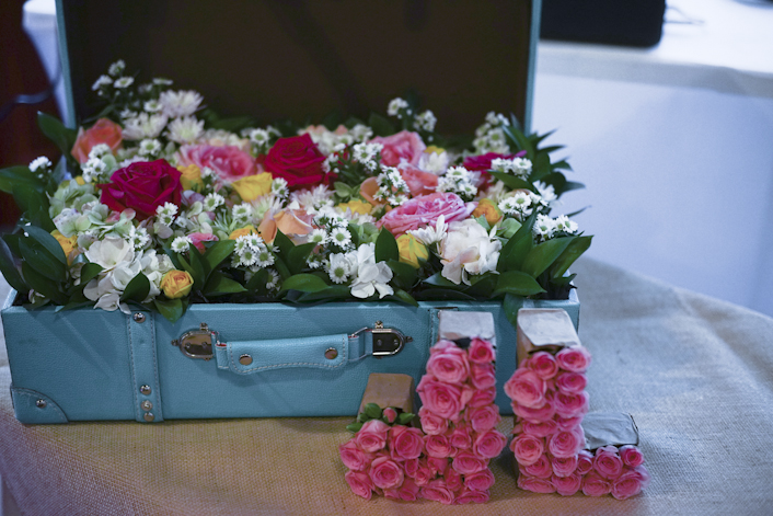 La ceremonia se celebró al final de la sala, mirando hacia los ventanales. Decoramos la mesa con una maleta llena de flores, botes de cristal decorados especialmente para esta boda y las iniciales de los novios hechas con flores (al fín puse en práctica yo misma lo que tanto os predico…).