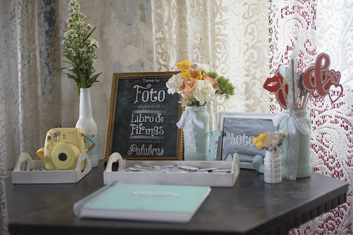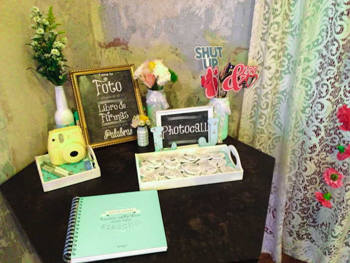 Pusimos unas bandejas con bolis y washi tape, para pegar las fotos en el libro de firmas, y otra bandeja con las divertidas «chapas con superpoderes» de Mr. Wondeful. También había un botecito con los típicos elementos de photocall (gafas, bigotes, etc) pero discretitos y con clase, el marco con las iniciales de los novios personalizadas y otro marquito con las instrucciones del photocall.