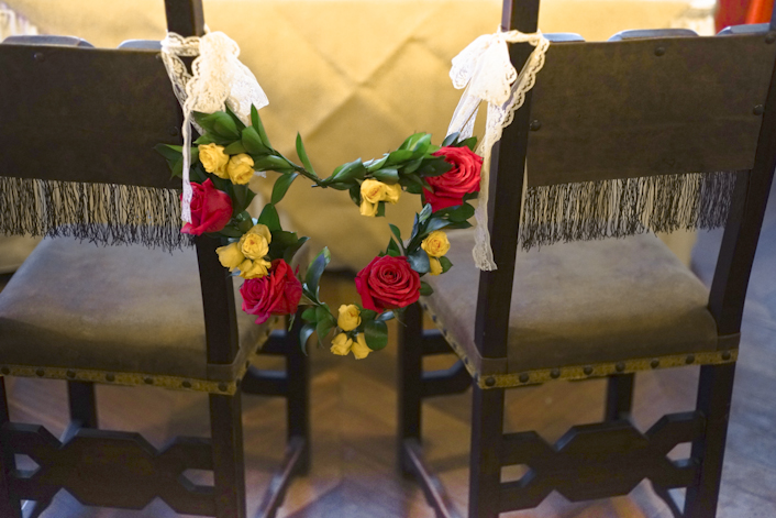 Las sillas de los novios son antigüedades del hotel, y las decoramos con un corazón de flores y puntillas que me encanta coleccionar de diferentes partes del mundo, aunque estas en concreto venían de Barcelona.