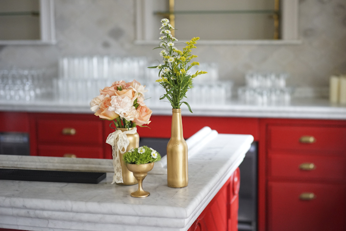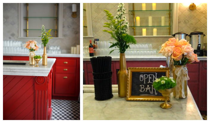 La zona de bebidas quedaba en una sala aparte, por lo que opté por hacer una decoración un poco diferente, con botes dorados.