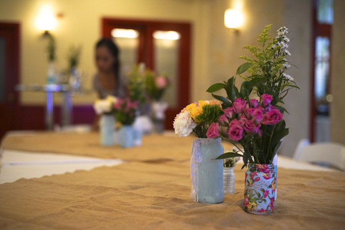 La celebración fue tipo aperitivo, con mesas altas a las que pusimos botellines de flores y una mesa alargada con los mismos botes.