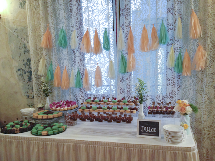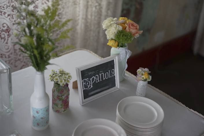 Los novios tenían raices cubanas, venezolanas y panameñas, así que uno de los buffets fue la mesa «Venecubana», para la que decoramos botes con las banderas de los tres paises. La foto es de ántes de poner el mantel, después no caí en sacarle otra foto…