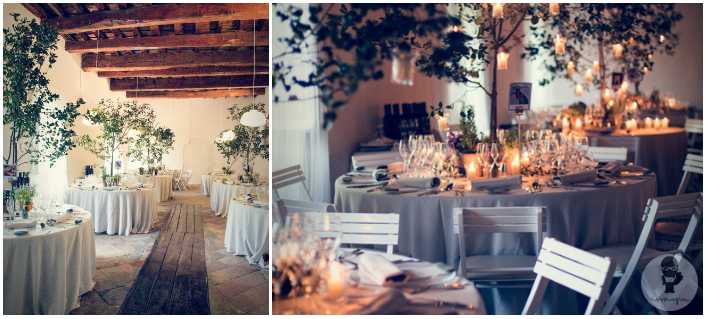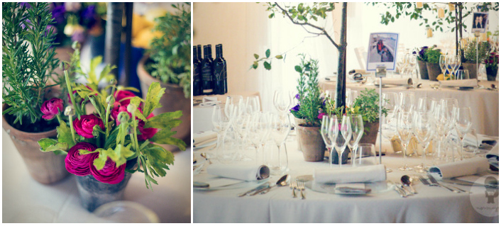La cena se celebró en un salón interior. Como centros de mesa se utilizaron ramas altas que simulaban árboles que salían del medio de la mesa, con velas colgando que dieron un aspecto muy romántico cuando se hizo de noche. A los pies de los «árboles», se pusieron macetas azules y de barro, con menta, romero, limones y ranúnculos.