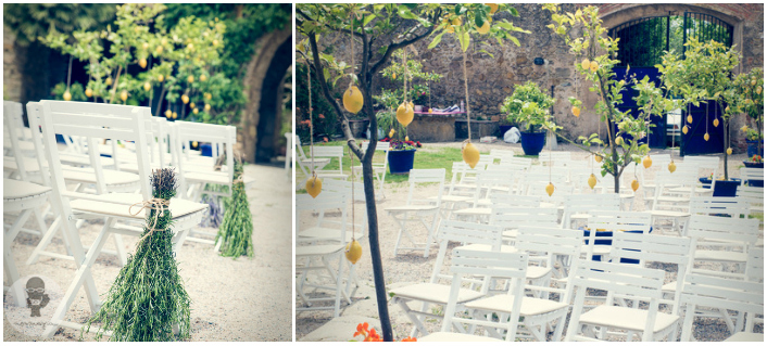 Para decorar el patio principal de la finca, donde se celebró la ceremonia, se utilizaron macetas en color azul eléctrico, con árboles que tenían limones colgando. De las sillas colgaban ramilletes de plantas aromáticas, que envolvieron la ceremonia de un agradable perfume.